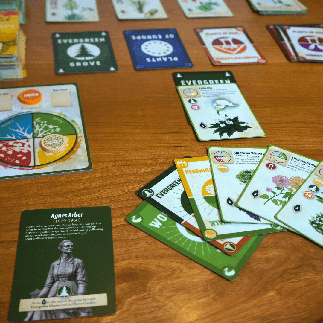 Players set up the game by placing the Calendar in the center of the table, putting the Year Token on Year One, and the Season Token on Spring. Next, shuffle the Specialist Cards and deal one to each player, returning any unused cards to the box. Then, shuffle the Plant Cards, deal five to each player, place three face-up in the Community Garden, and set the remaining cards aside as the Draw Pile.